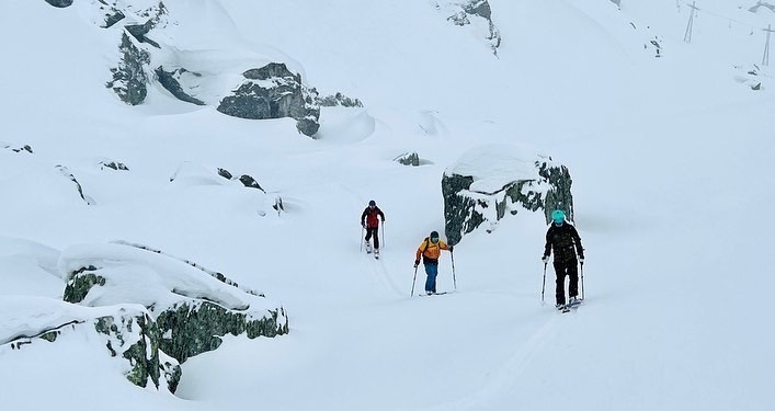 Na het checken van de lawine-pieper, wat geklooi met de toer-ski-bindingen (omdat je er vrij precies in moet stappen) en het op scherp zetten van de airbag, gaan we opzoek naar dikke poeder. Traverserend tussen de rotsen, gaan we door de mist de piste af… op naar de eerste bochten. De lichte zenuwen zorgen er natúúrlijk voor dat de techniek achterblijft. In de tiende bocht maak ik dan ook een lekkere flinke val. Ik voel me klunzig. Leermomentje: juiste vol gaan, anders breng je het niet tot een goed einde.